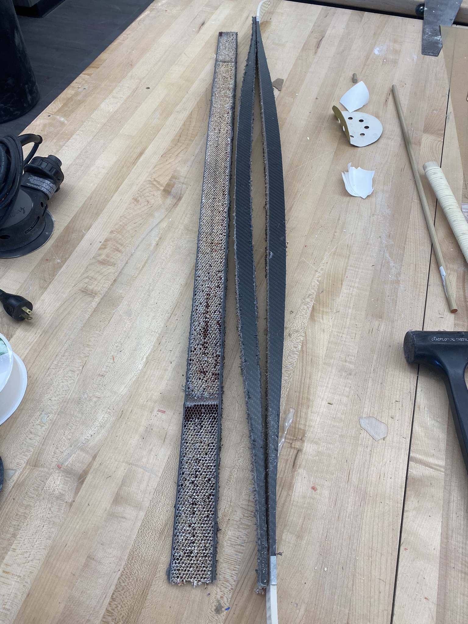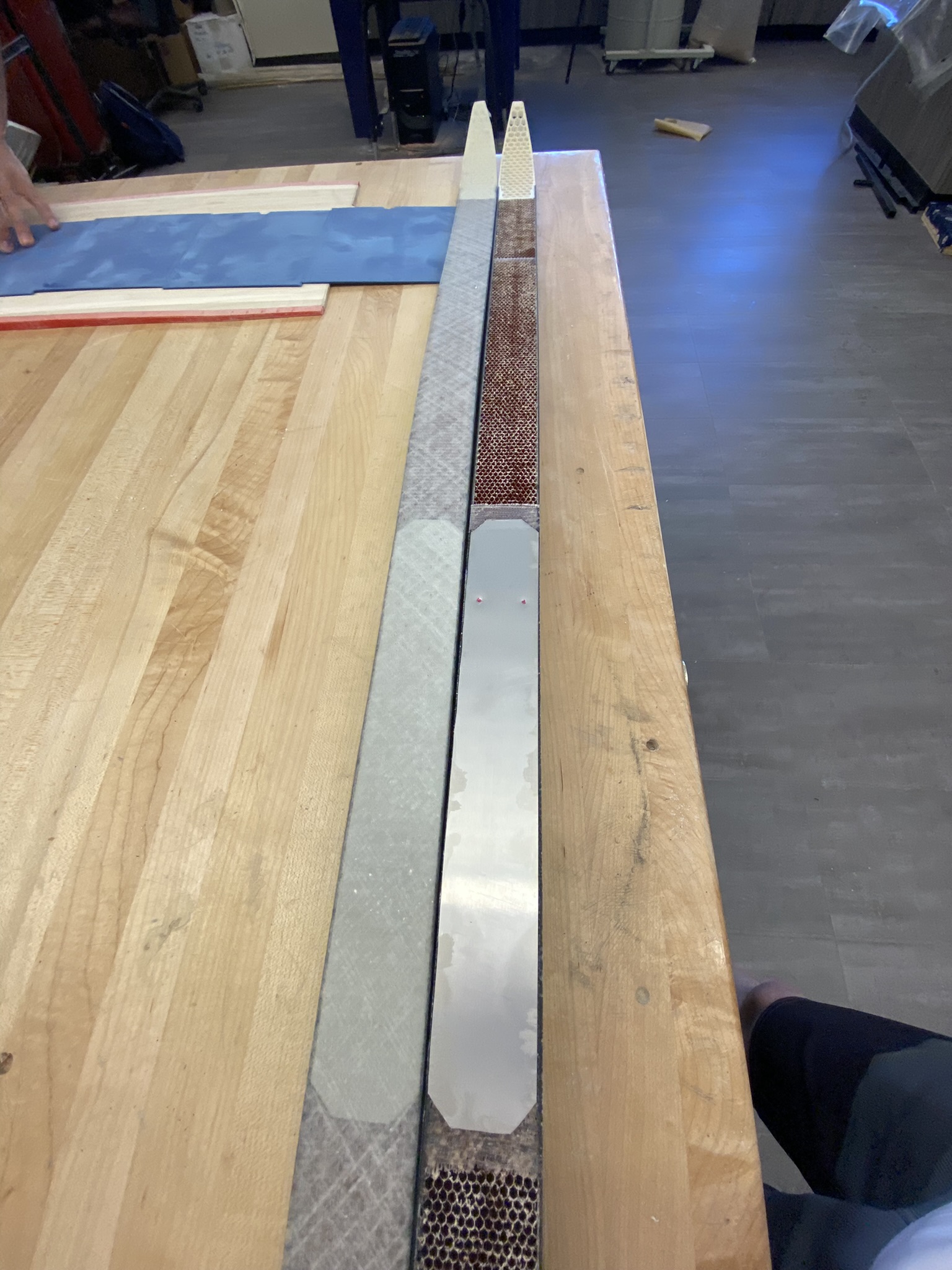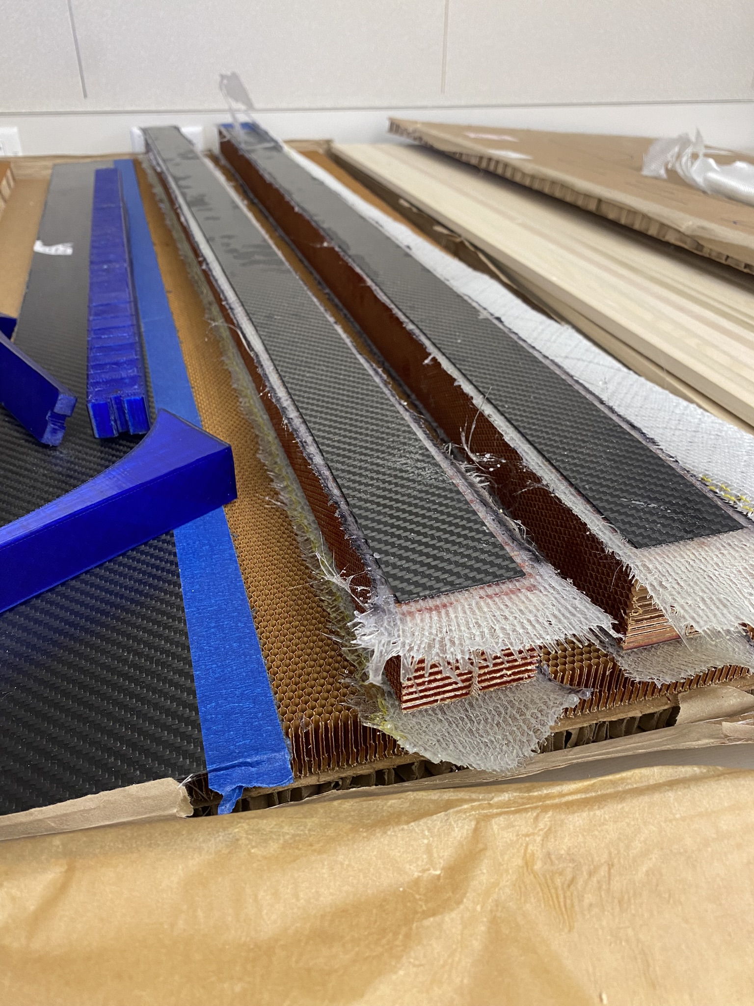 The first blank experienced some chatter that thinned the tips, but I corrected this in subsequent pieces by adjusting tab positions and fixturing. Between machining and topsheet application, I spent 3-4 hours hand-picking nomex material from the honeycomb cells for both aesthetics and proper resin adhesion.