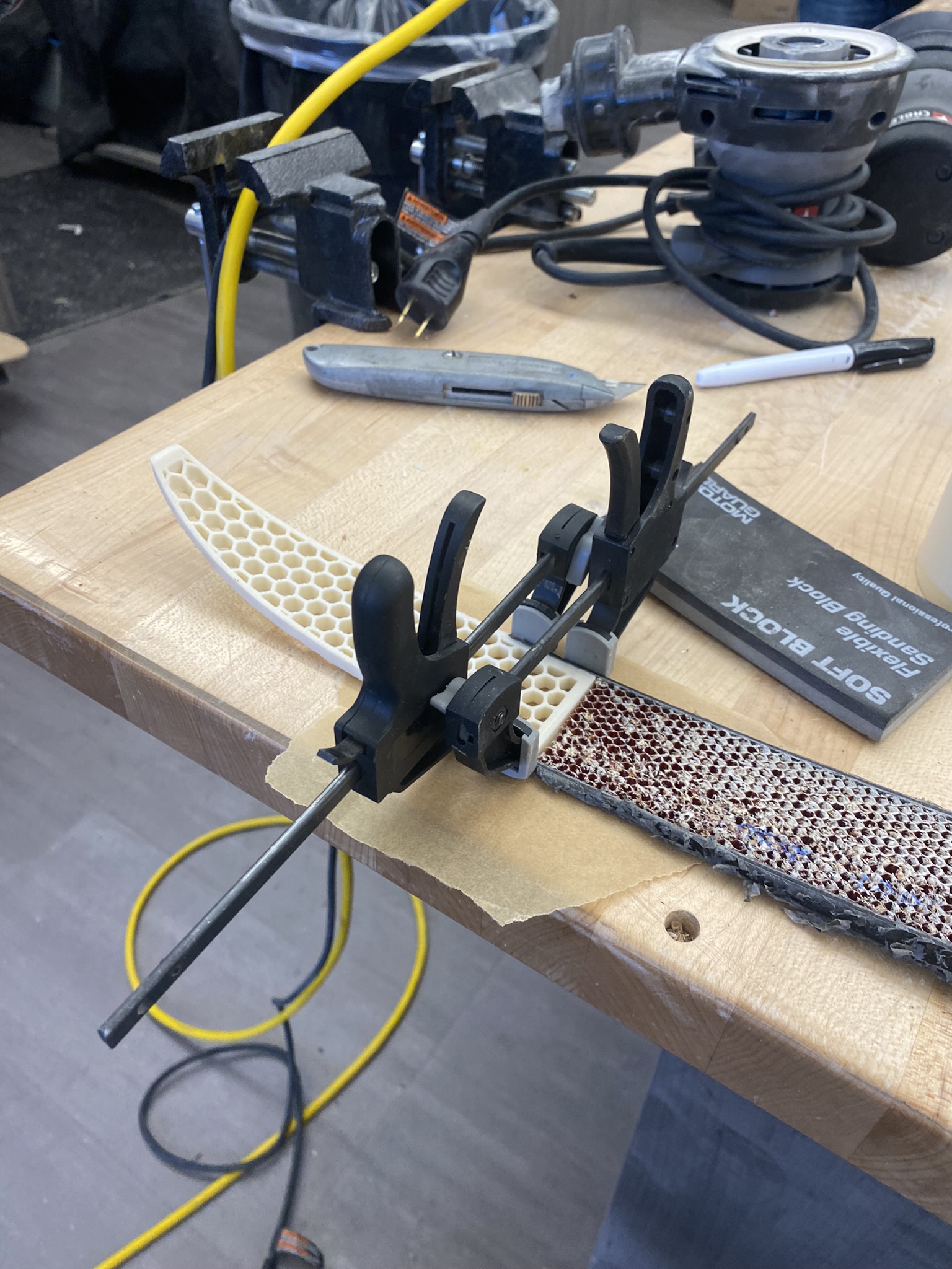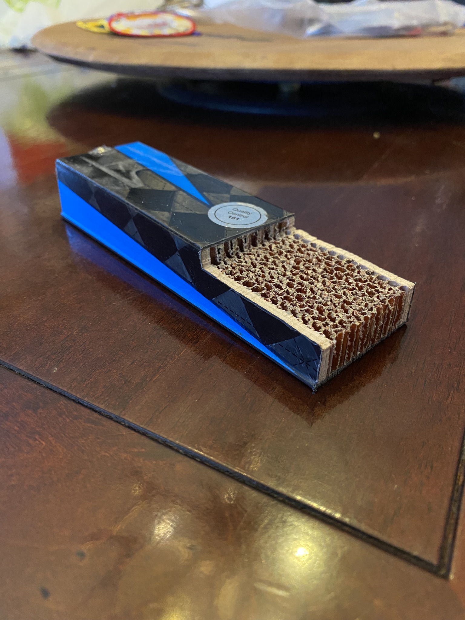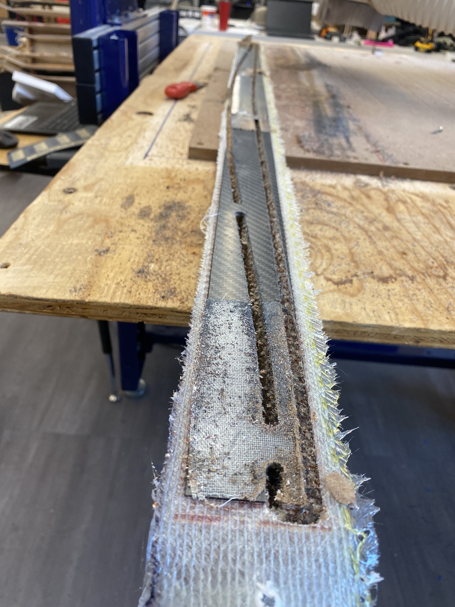 The first blank experienced some chatter that thinned the tips, but I corrected this in subsequent pieces by adjusting tab positions and fixturing. Between machining and topsheet application, I spent 3-4 hours hand-picking nomex material from the honeycomb cells for both aesthetics and proper resin adhesion.