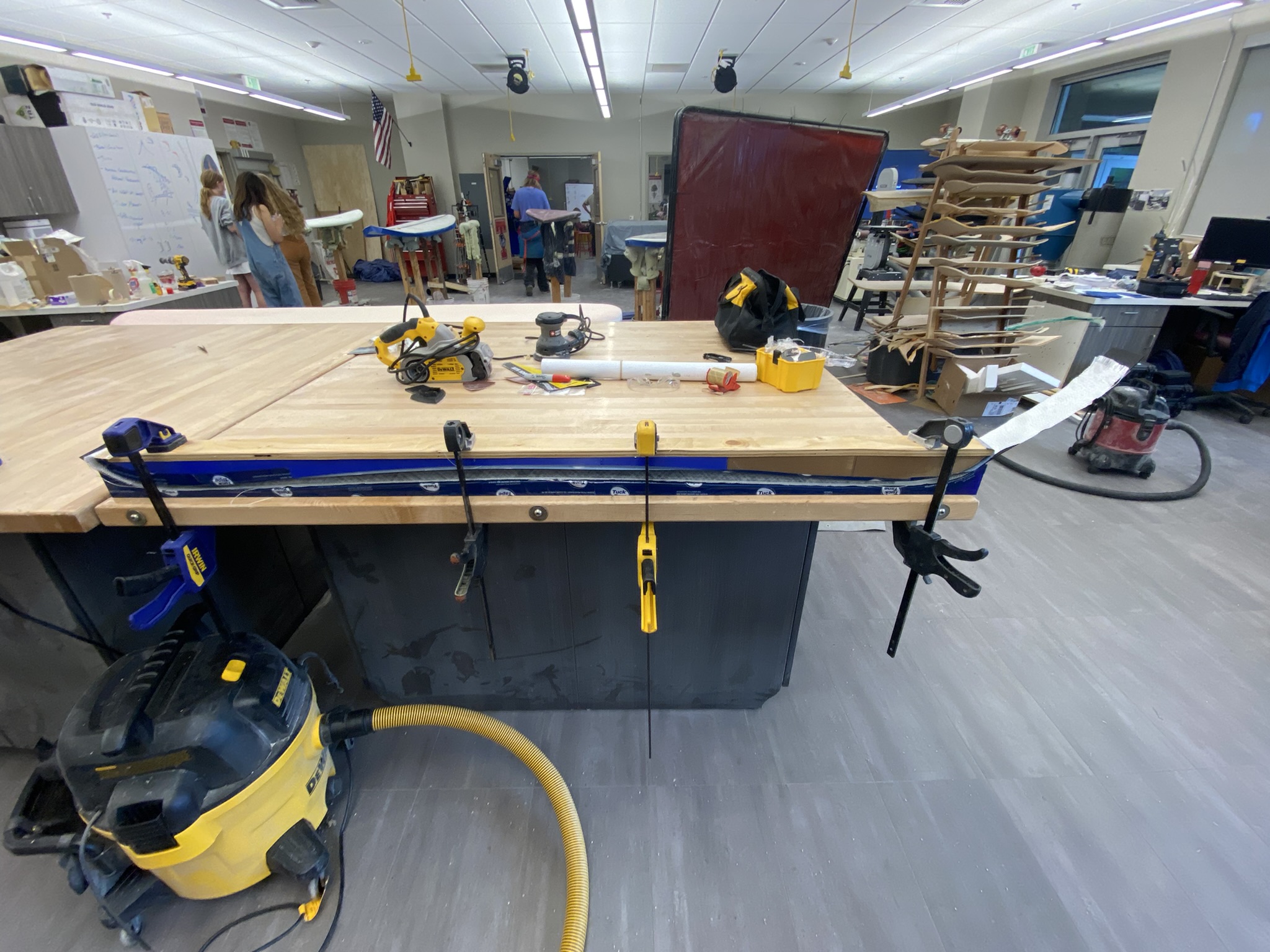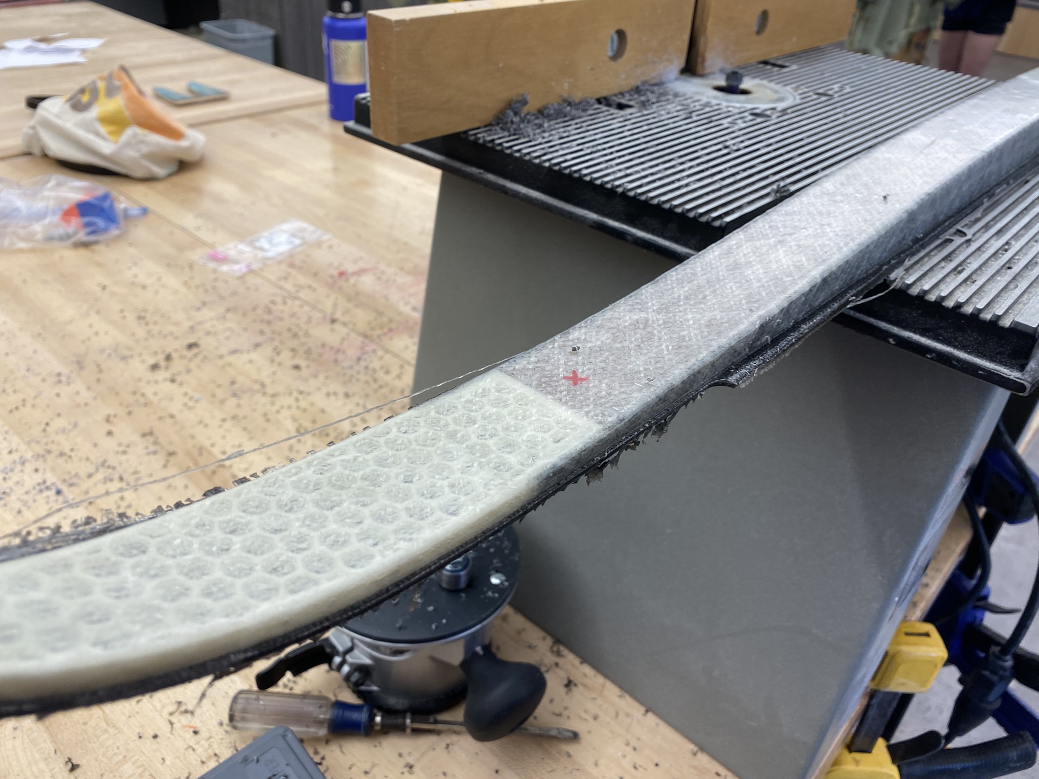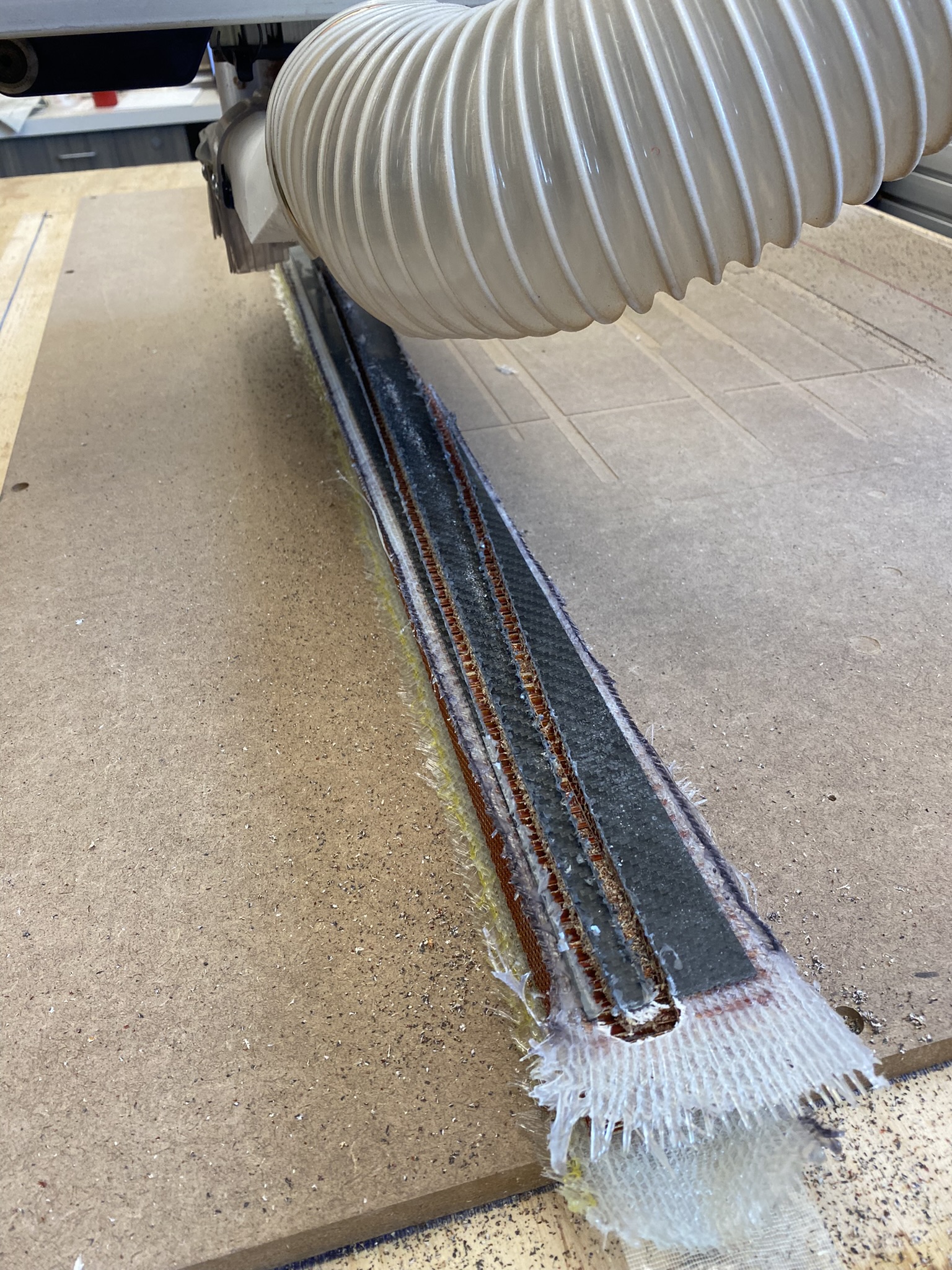 Using carpet tape for work-holding, I routed the ski profiles from the composite stack-up.
