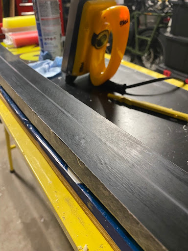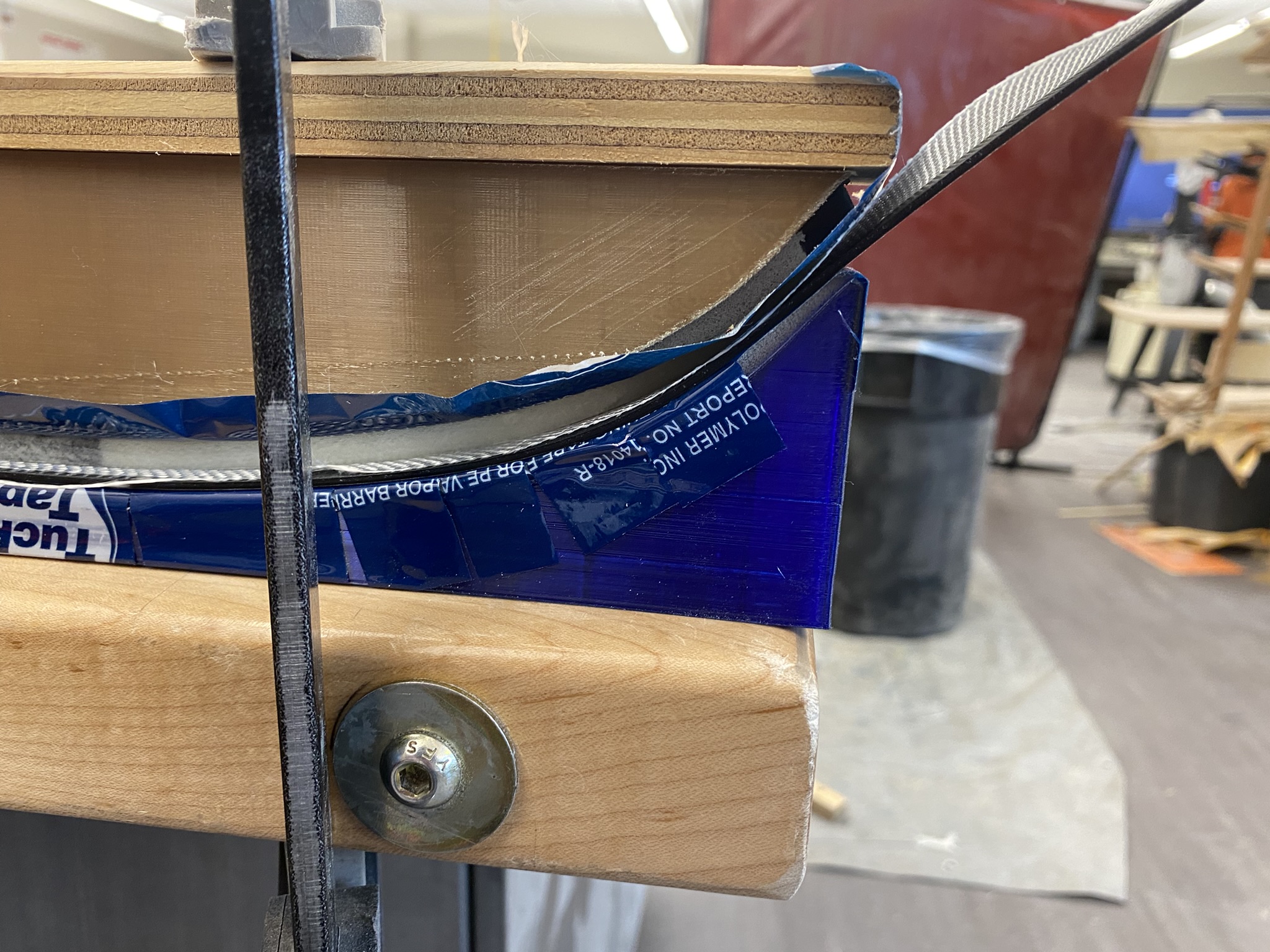 For the topsheet, I used vacuum bag lamination which was critical for proper sidewall conformity. The custom jig kept the ski elevated so the topsheet could flow down the sides and slightly underneath.