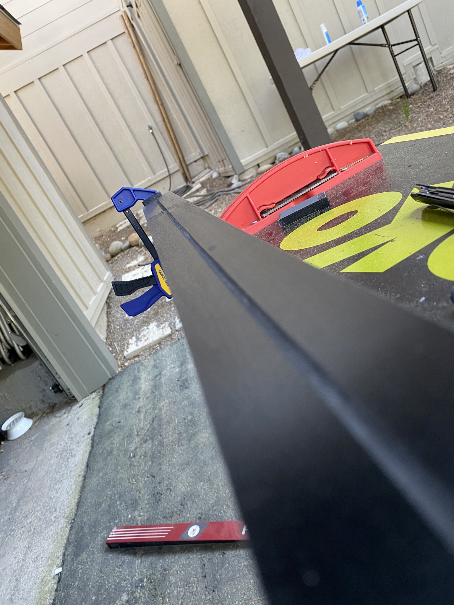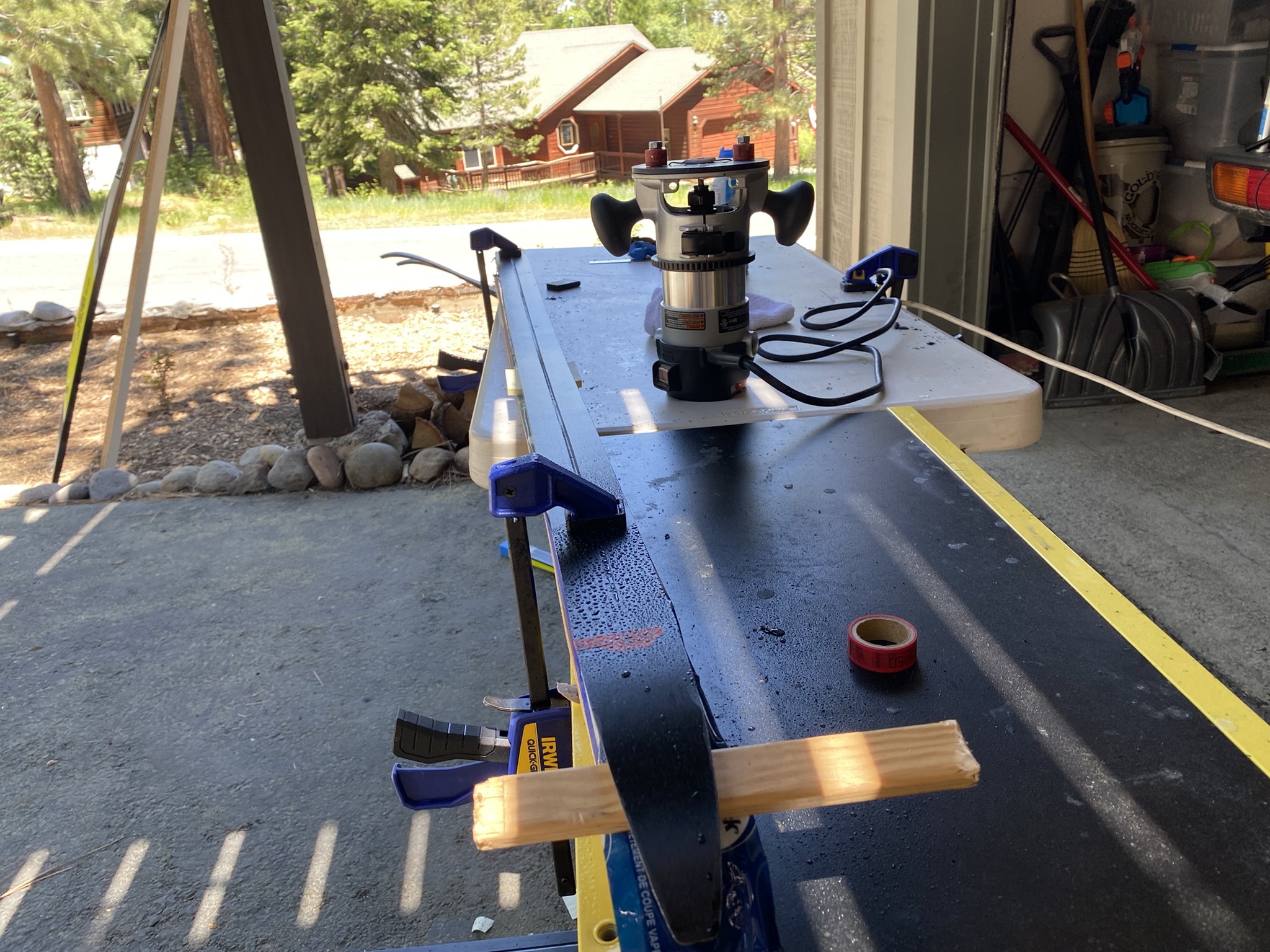 I ended up throwing on a ring of PTFE around the cutting bit at the last second to reduce friction. This and spraying water onto the surface helped to keep the hand router moving smoothly across the ski.
