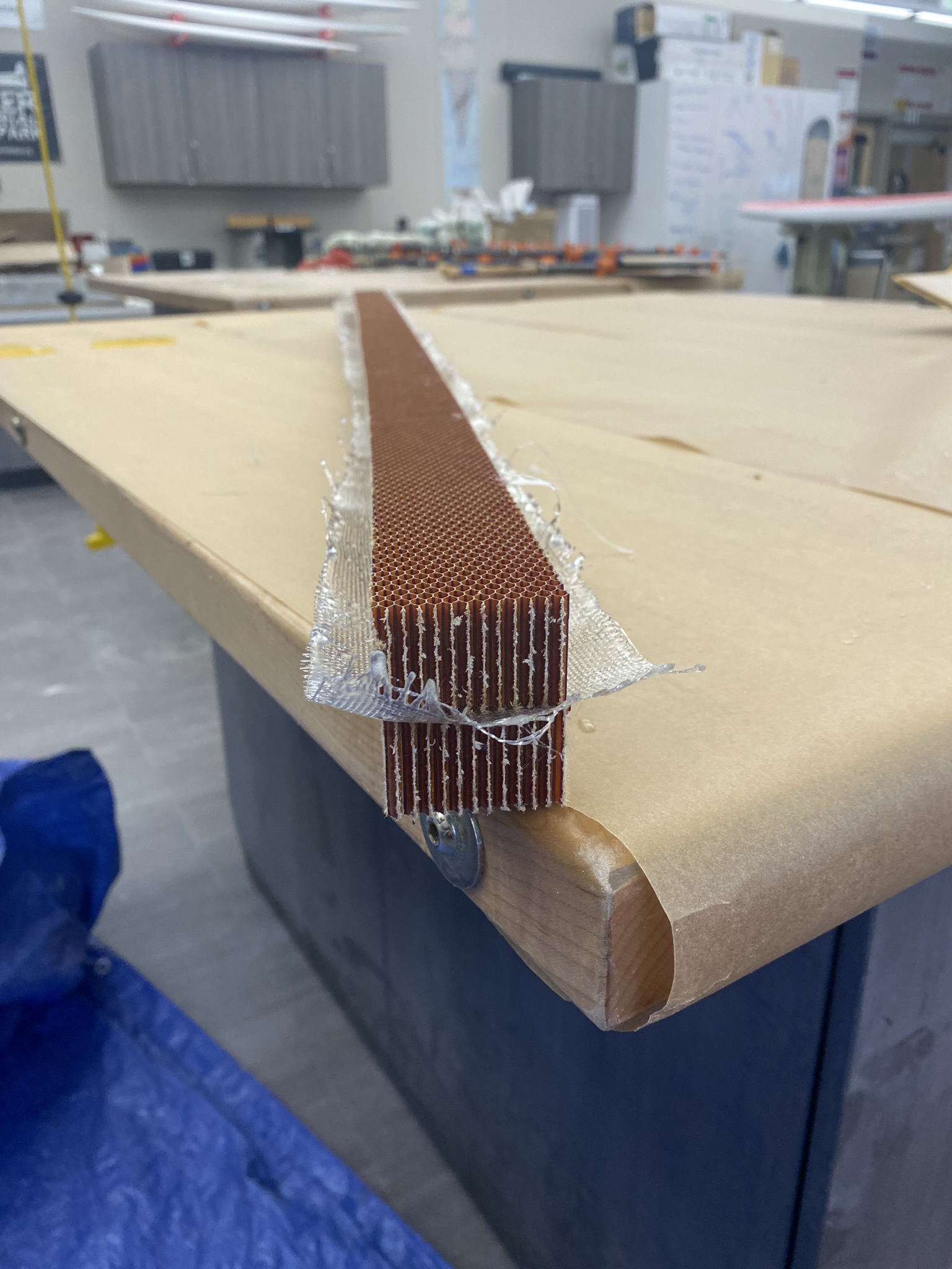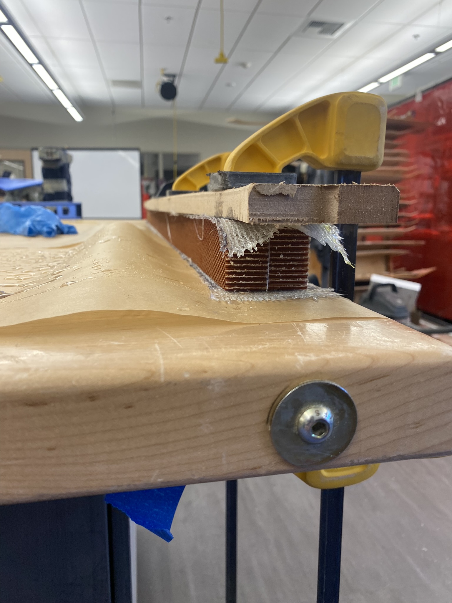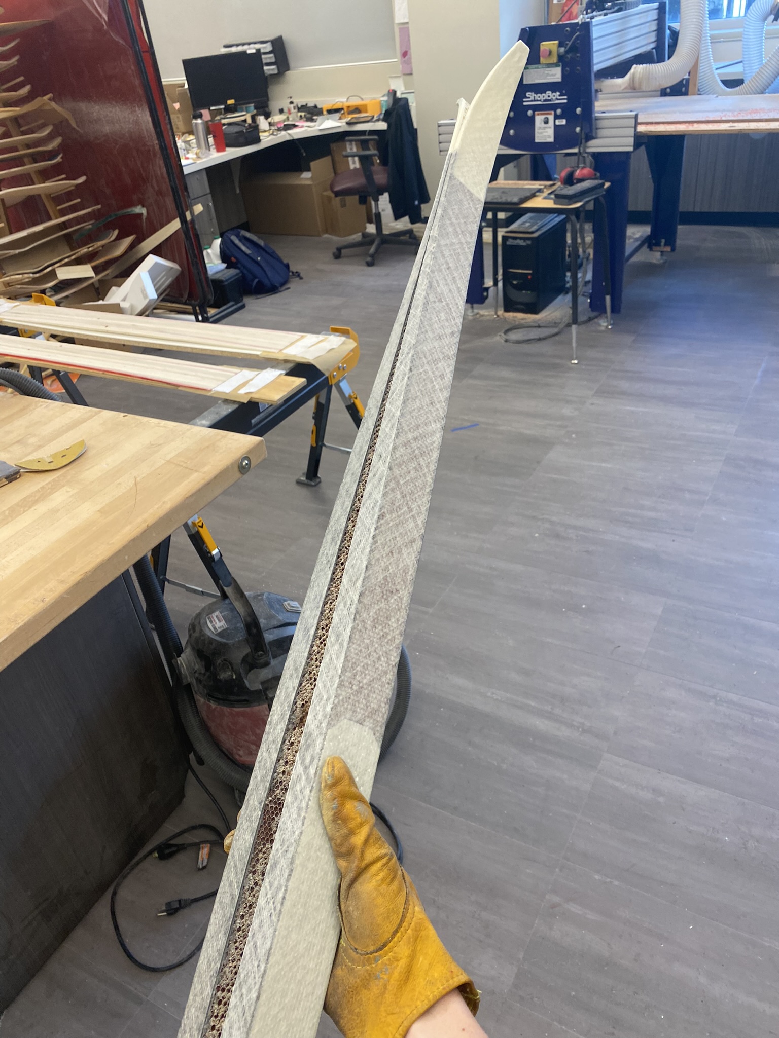 I couldn't source nomex thick enough for the full ski height, so I stacked two cuts together, bonding them with resin and fiberglass. The fiberglass topsheet was chosen over carbon to showcase the internal structure. I had just enough material for three blanks, perfect for having one sacrificial prototype to learn from.