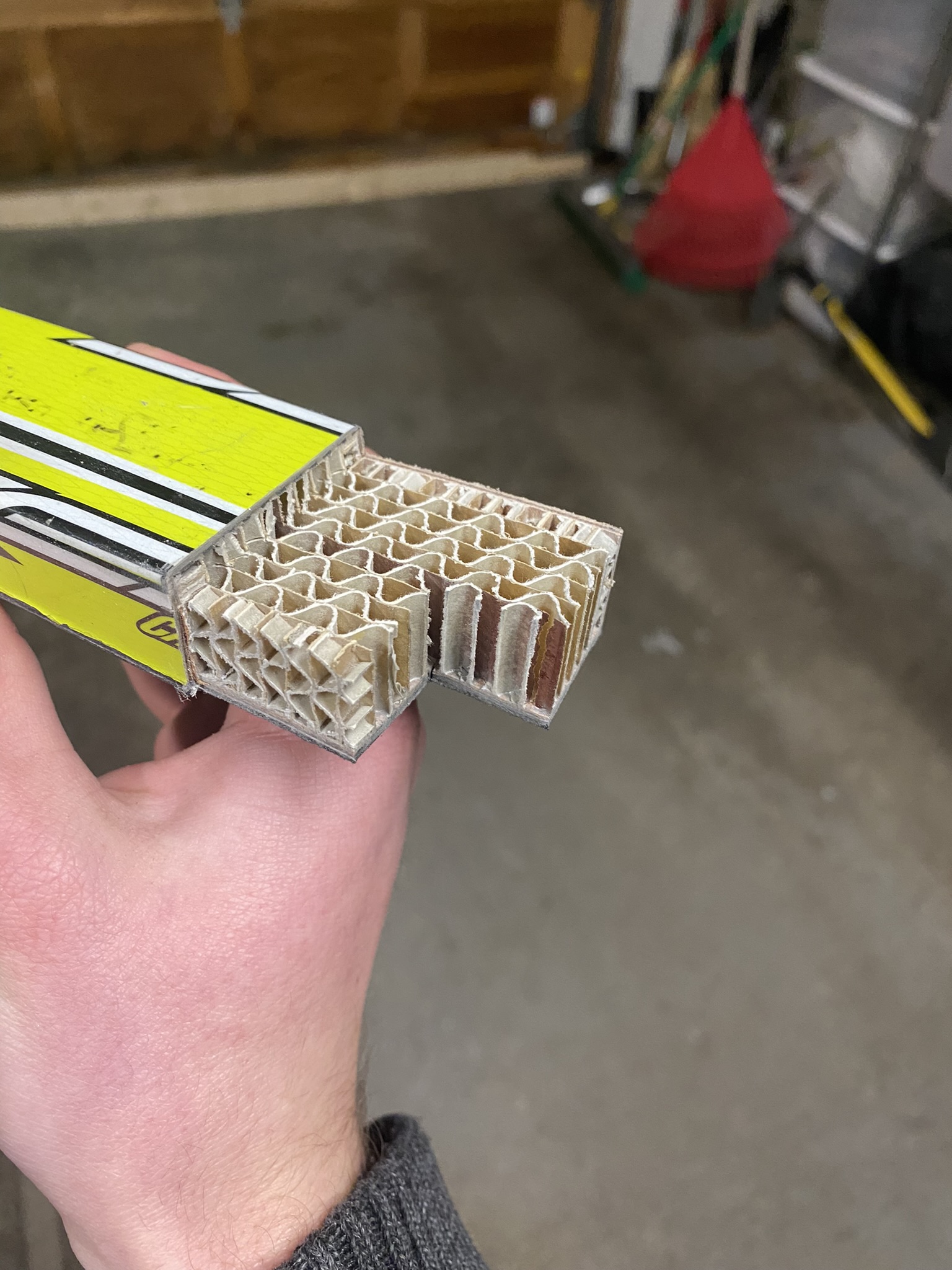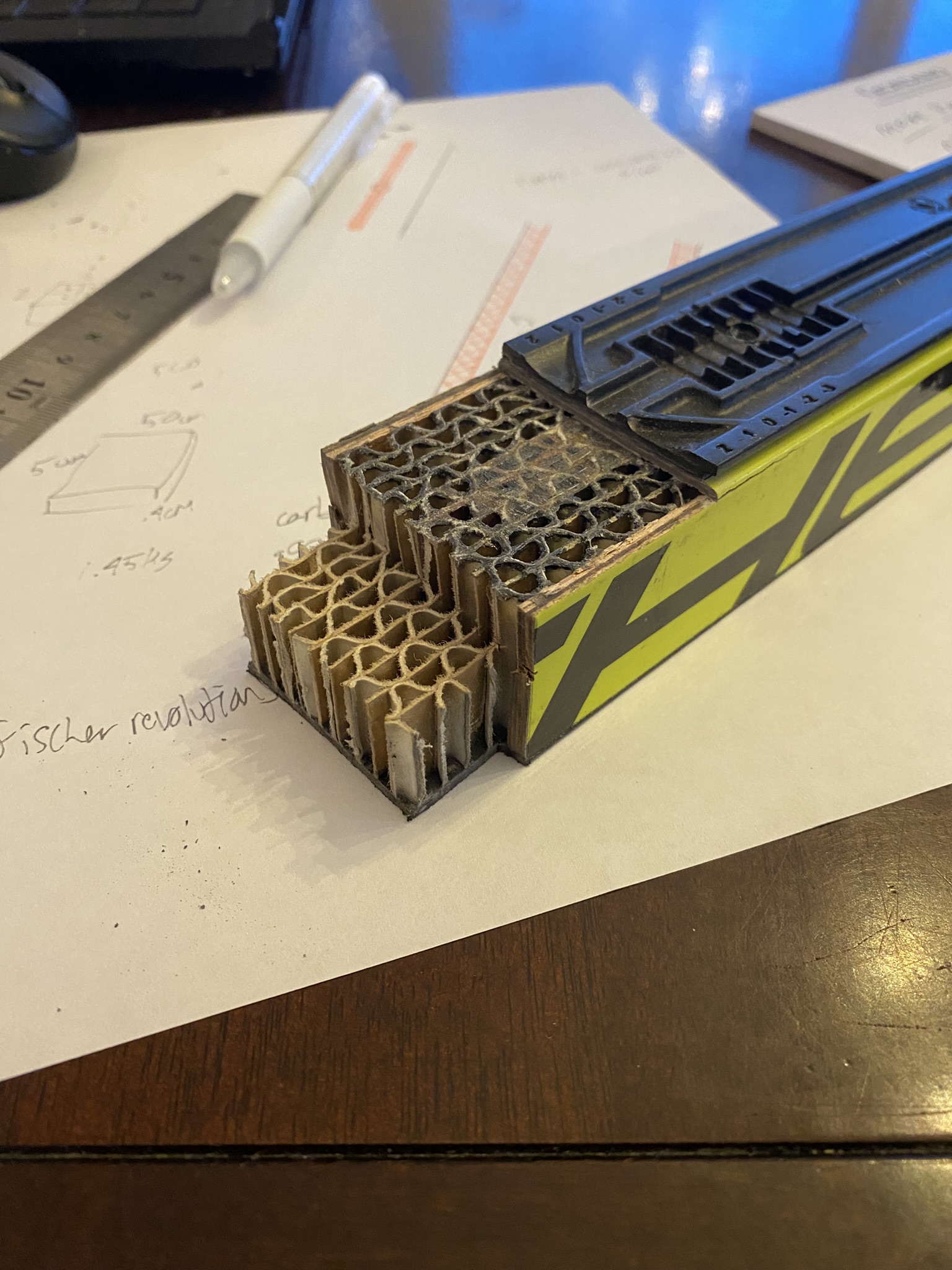 Through research of publicly available manufacturer data and analysis of broken skis, I determined the optimal material stack-up. Salomon S/lab uses a nomex core, wood sidewalls, and a carbon topsheet, while Fischer uses their own proprietary core design.