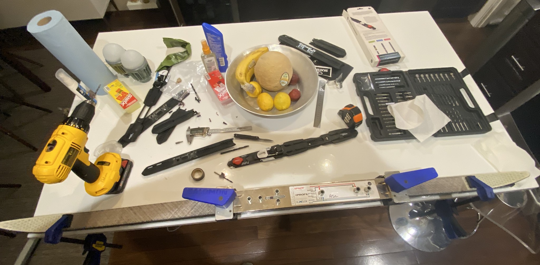 I drilled out the hole pattern and put the bindings on (in the kitchen because I was running out of time…)