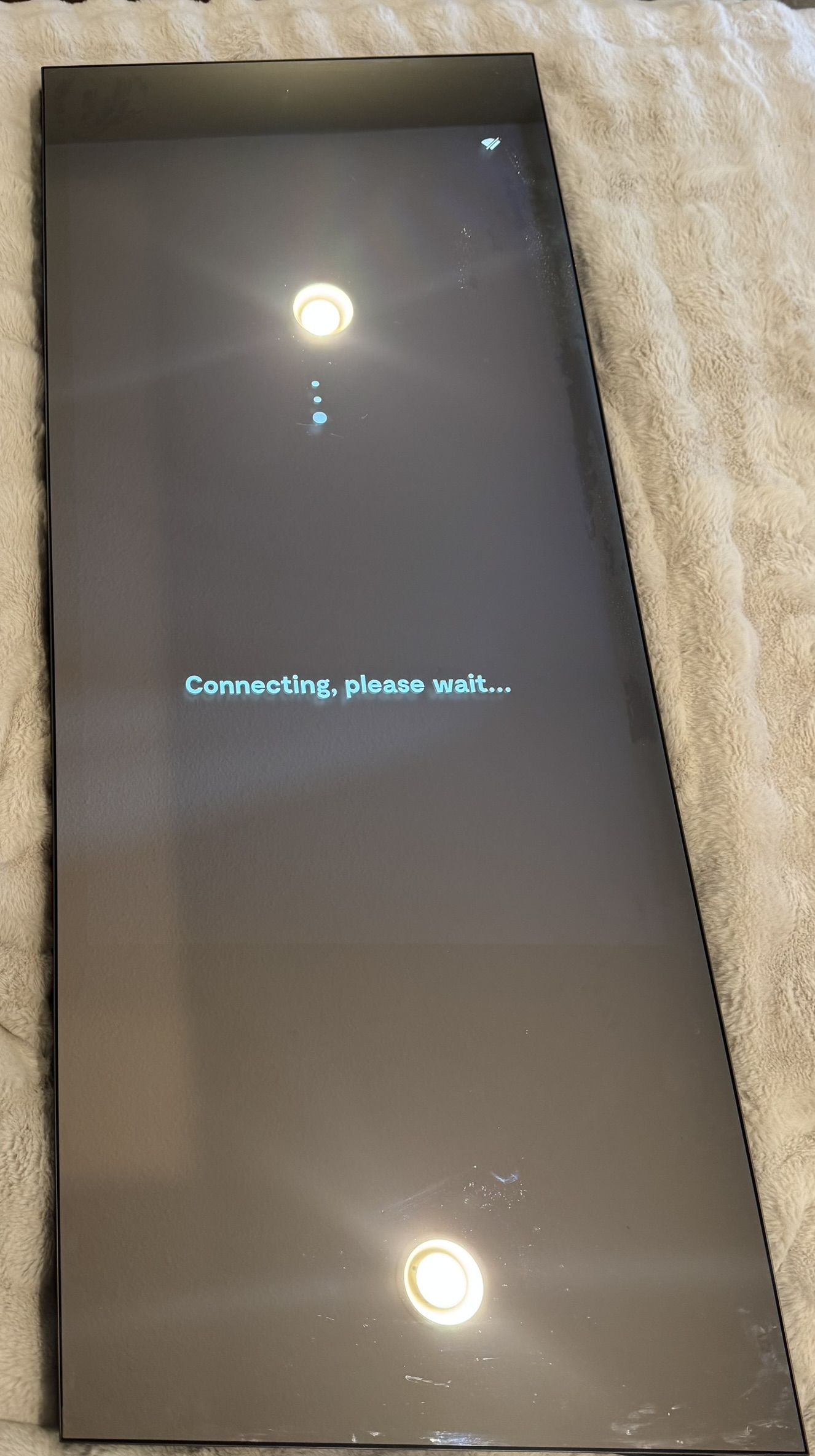 Because this unit has never been connected to my Wi-Fi, and Lululemon no longer allows new accounts to be created, this is as far as the stock software will go. The system powers on just fine, and then shows a loading screen while trying to connect to the internet. Sometimes if you wait long enough it will ask for you to connect to it from your phone using a new wifi network that it made, however you still cannot do anything because that requires an account which we don't have.