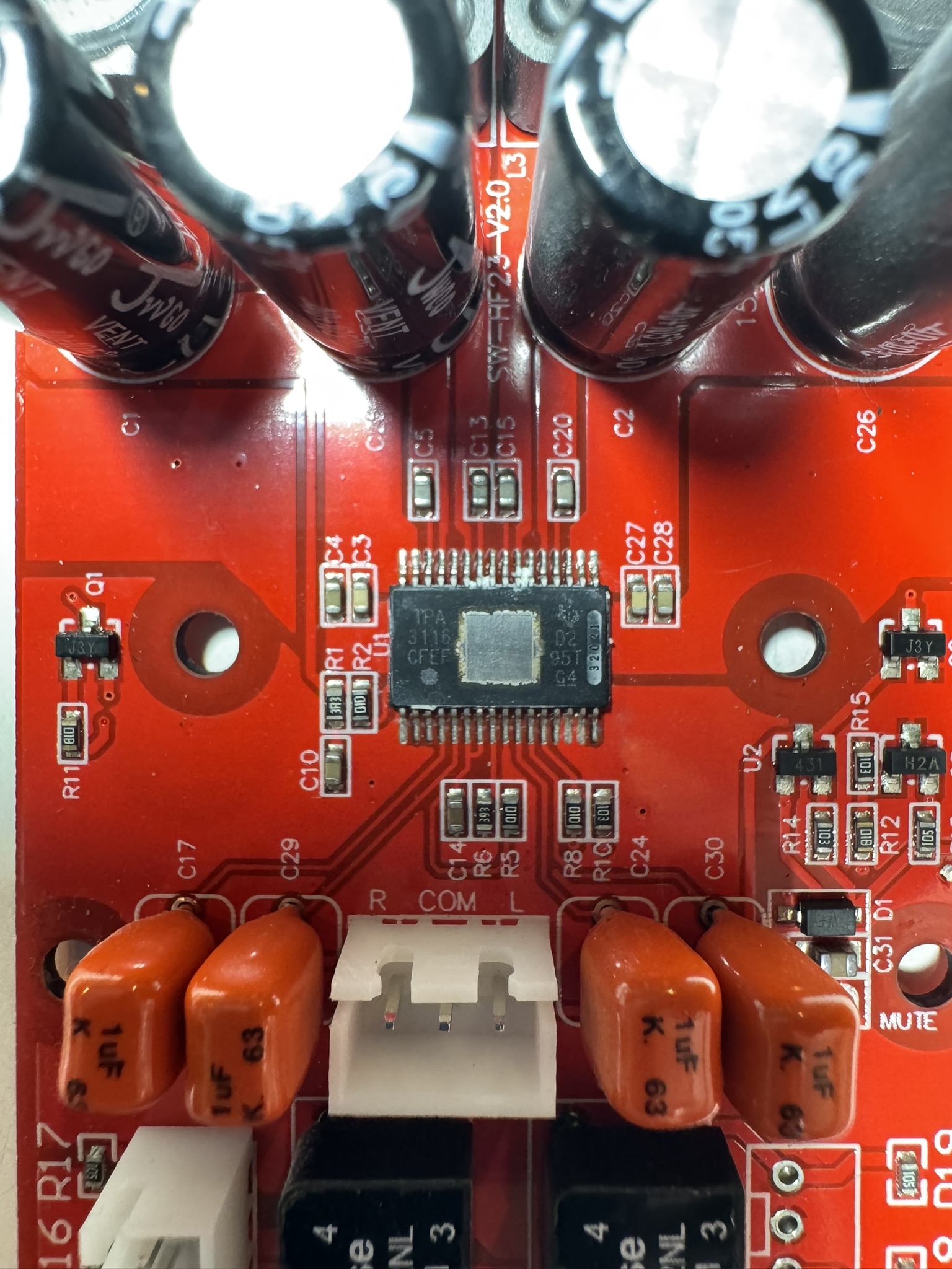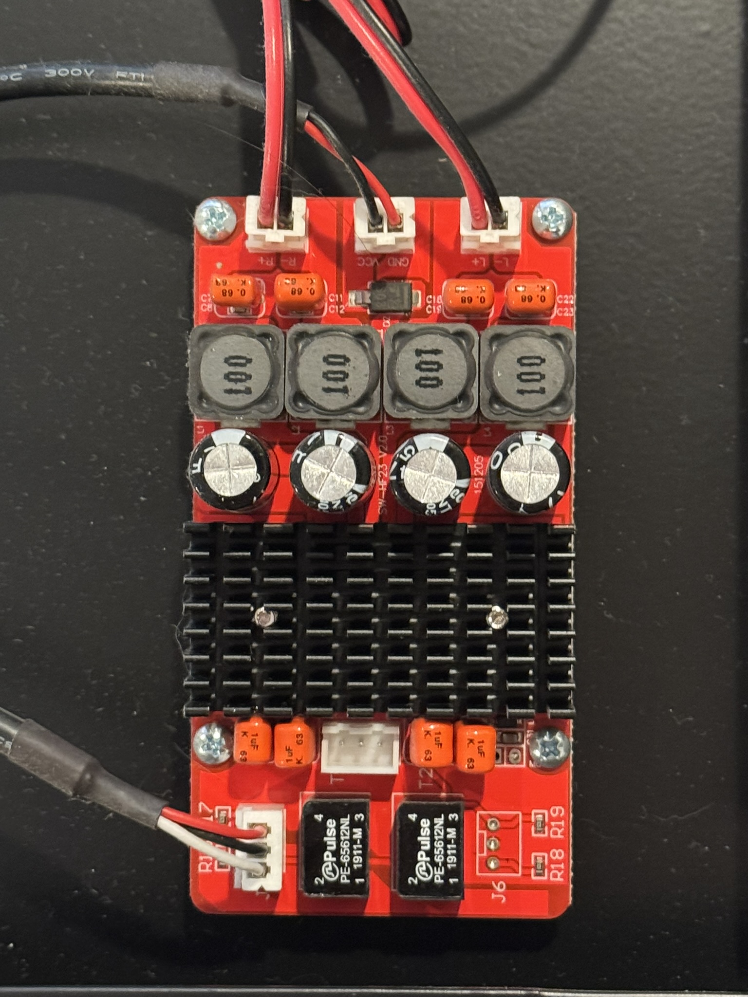 Audio output is handled by a board based on the TI TPA3116D2, a widely used Class-D amplifier capable of 50W stereo or 100W mono operation.