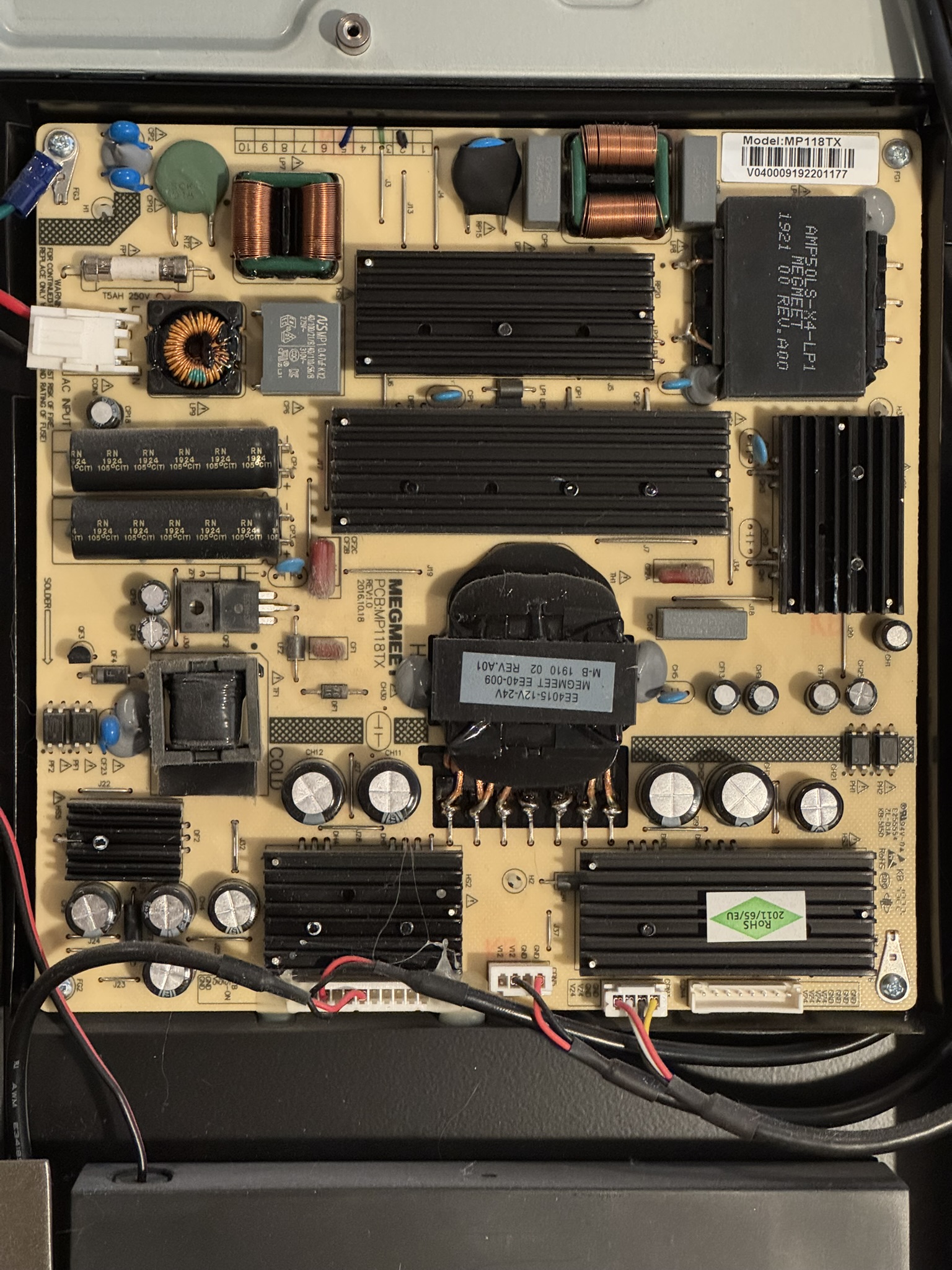 The power supply is a dedicated MP118TX unit commonly used in digital signage. After tracking down multiple vendor listings and comparing specifications, it appears capable of supplying: