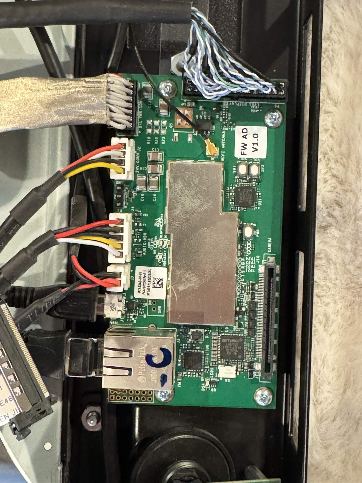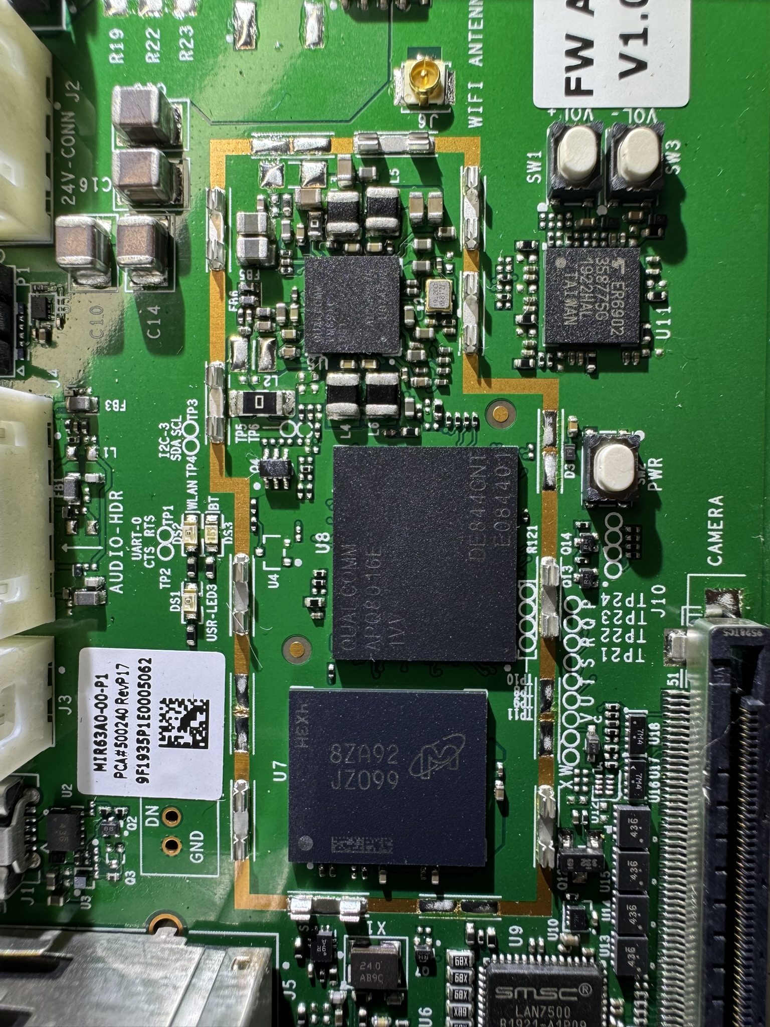 This mirror runs on Andriod OS. Taking a closer look at the mainboard and popping off some shielding cans, we can see that it uses a Qualcomm Snapdragon 410E (APQ 8016E), an ARM Cortex-A53 microprocessor with a max clock speed of 1.2GHz.